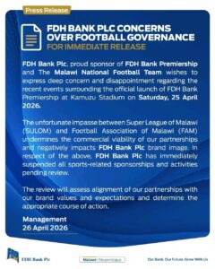 “As a result, FDH Bank Plc has immediately suspended all sports-related sponsorships and activities pending review,” reads part of the statement, with the bank warning that the impasse “undermines the commercial viability” of its investment and negatively affects its brand image.